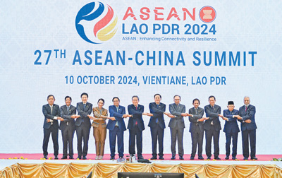 本报万象10月10日电 (记者陈尚文、杨一)当地时间10月10日,国务院总理李强在老挝万象出席第27次中国—东盟(10+1)领导人会议。东盟轮值主席国老挝总理宋赛、文莱苏丹哈桑纳尔、柬埔寨首相洪玛奈、印尼副总统马鲁夫、马来西亚总理安瓦尔、菲律宾总统马科斯、新加坡总理黄循财、泰国总理佩通坦、越南总理范明政、缅甸外交部常秘昂觉莫、东盟观察员东帝汶总理夏纳纳与会。东盟秘书长高金洪出席。