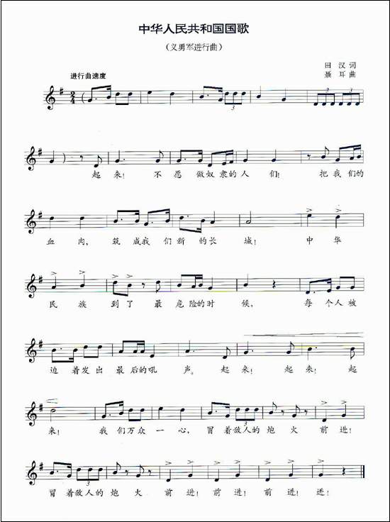 1949年11月15日,《人民日报》发表的新华社答读者问中关于国歌的说明是:《义勇军进行曲》是十余年来在中国广大人民的革命斗争中最流行的歌曲,已经具有历史意义。采用《义勇军进行曲》为中华人民共和国现时的国歌而不加修改,是为了唤起人民回想祖国创建过程中的艰难忧患,鼓舞人民发扬反抗帝国主义侵略的爱国热情,把革命进行到底。这与苏联人民曾在长期间以国际歌为国歌,法国人民今天仍以马赛曲为国歌的作用是一样的。
