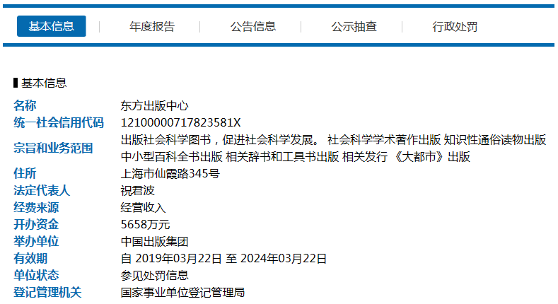经查,东方出版中心存在不按规定申请法定代表人变更登记的行为,依据《事业单位登记管理暂行条例实施细则》第七十条规定,决定对该单位作出书面警告并通报举办单位的行政处罚。