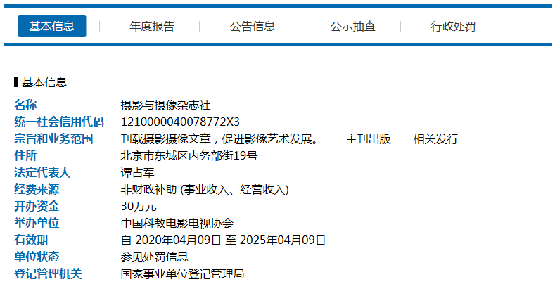 经查,摄影与摄像杂志社存在不按规定报送并公示2020年度报告的行为,依据《事业单位登记管理暂行条例实施细则》第七十条规定,决定对该单位作出书面警告并通报举办单位的行政处罚,同时责令补报。