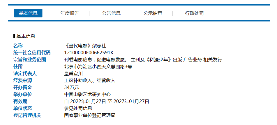 经查,《当代电影》杂志社存在不按规定报送并公示2021年度报告的行为,依据《事业单位登记管理暂行条例实施细则》第七十条规定,决定对该单位作出书面警告并通报举办单位的行政处罚,同时责令补报。