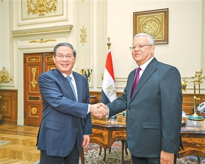 李强指出,中方愿同埃方深化发展对接,以高质量共建“一带一路”为引领,以中阿、中非两个合作论坛为依托,推动两国经贸合作不断提质增效。双方要抓好双边标志性项目的可持续运营合作,不断提升双向贸易投资便利化水平,加强产业对接和市场联通,拓展数字经济、绿色发展等新兴领域合作,推进更高水平的互利共赢。中方愿同埃方在联合国、金砖国家、上海合作组织等机制密切沟通协作,推动各方共同维护国际关系基本准则和多边贸易体制,为全球和平和发展事业注入更多正能量。