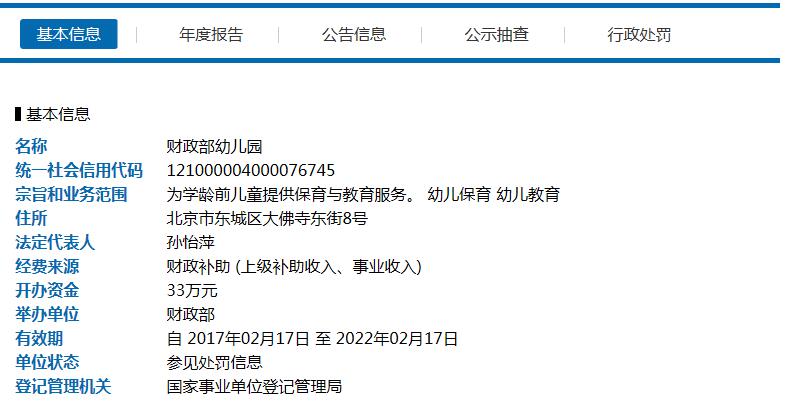 经查,财政部幼儿园存在不按规定申请法定代表人变更登记的行为,依据《事业单位登记管理暂行条例实施细则》第七十条规定,决定对该单位作出书面警告并通报举办单位的行政处罚。