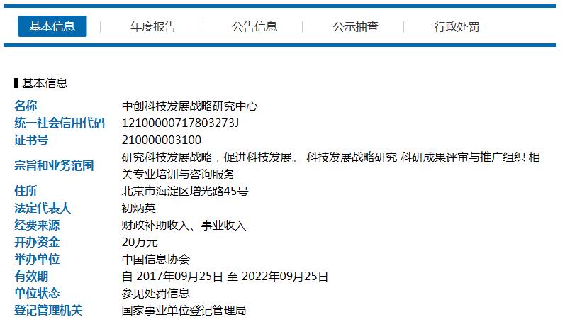 国家事业单位登记管理局对中创科技发展战略研究中心作出行政处罚