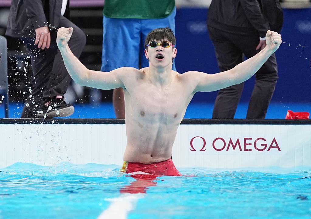 7月31日,中国选手潘展乐在比赛后庆祝。当日,在巴黎奥运会游泳项目男子100米自由泳决赛中,中国选手潘展乐以46秒40的成绩夺冠并打破世界纪录。新华社记者 杜宇 摄