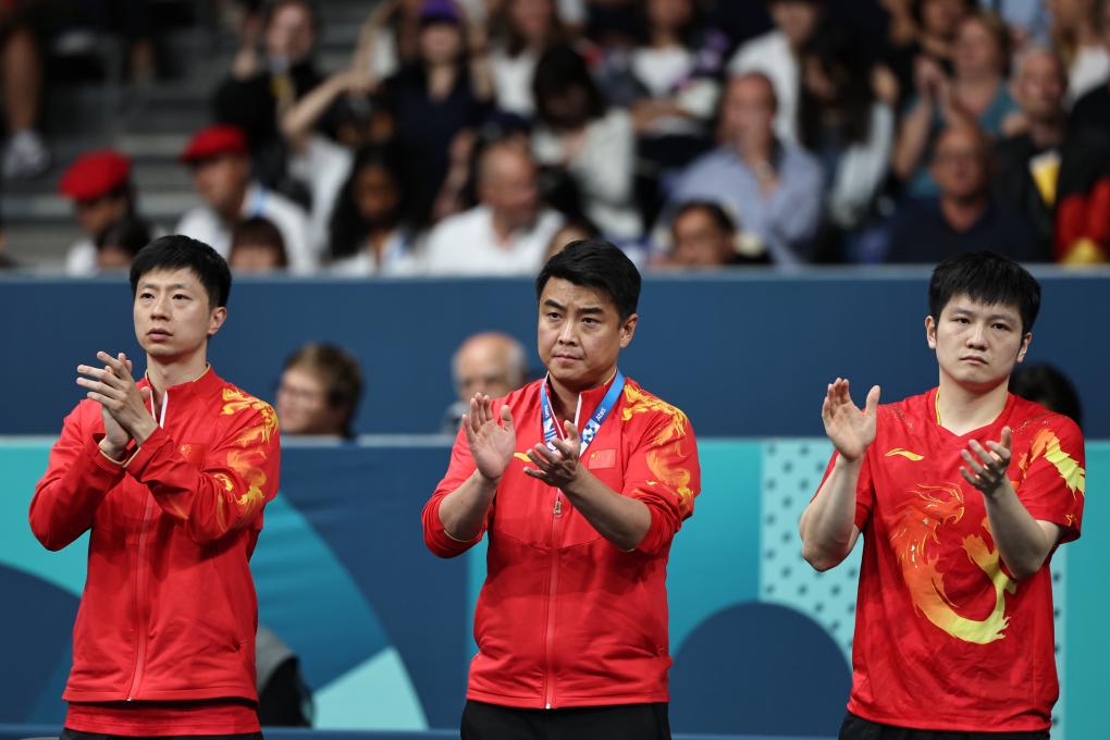 8月7日,马龙、王皓、樊振东(从左至右)为王楚钦加油。新华社记者 王东震 摄