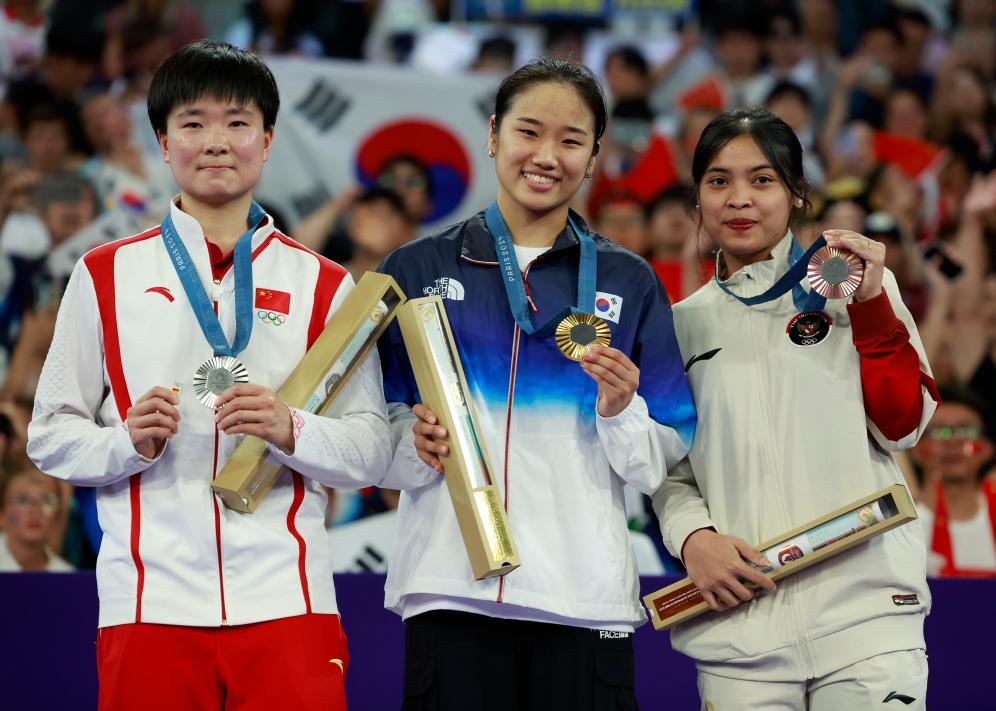 8月5日,冠军韩国选手安洗莹(中)、亚军中国选手何冰娇(左)、季军印度尼西亚选手玛丽斯卡在颁奖仪式上。 新华社记者 任正来 摄