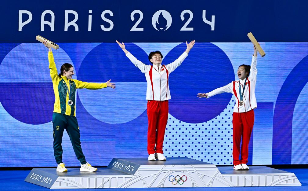 8月9日,冠军中国选手陈艺文(中)登上领奖台。当日,在巴黎奥运会跳水项目女子3米板决赛中,中国选手陈艺文获得金牌,澳大利亚选手基尼获得银牌,中国选手昌雅妮获得铜牌。新华社记者 王鹏 摄