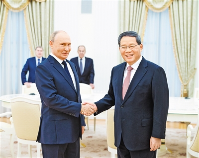 普京请李强转达他对习近平主席的亲切问候和良好祝愿。普京表示,今年是俄中建交75周年,是两国关系发展史上具有纪念意义的年份。今天上午两国总理举行年度会晤,就经贸、人文等领域合作深入交流,并签署系列合作文件,这是对我同习近平主席所达成重要共识的有力落实,取得丰硕成果。俄方愿同中方进一步加强互惠互利合作,扩大人文交往,密切在金砖国家等多边机制内的沟通协作,推动俄中新时代全面战略协作伙伴关系取得更大发展。
