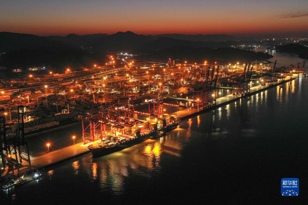 夜幕下,一艘货轮停靠在宁波舟山港穿山港区集装箱码头(2023年1月31日摄,无人机照片)。2022年宁波舟山港完成年货物吞吐量超12.5亿吨,连续14年位居全球第一;完成集装箱吞吐量3335万标准箱,位居全球第三。新华社记者 黄宗治 摄