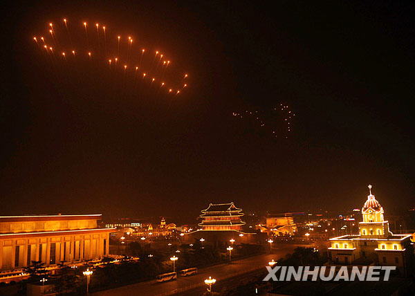 2008年8月8日晚,北京奥运会开幕式燃放焰火《历史足迹》。这是在天安门广场上空拍摄的“脚印”。新华社发