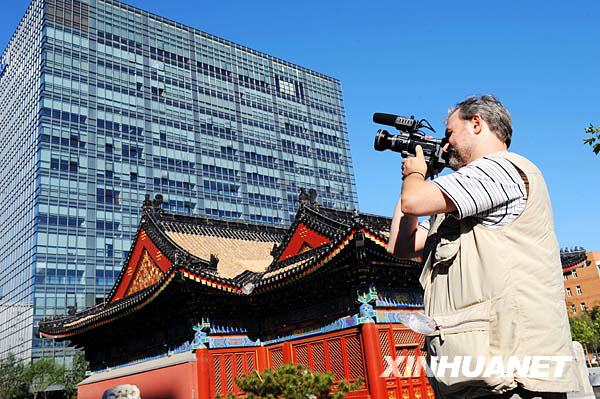 这是2008年10月23日,来自俄罗斯全国电视广播公司的记者鲍里斯在北京金融街街头拍摄。 新华社记者 杨光摄