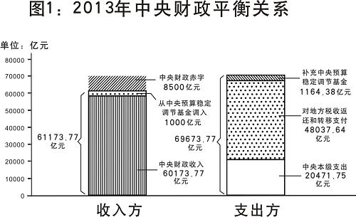 中央财政收入60173.77亿元,为预算的100.2%,增长7.1%。加上从中央预算稳定调节基金调入1000亿元,使用的收入总量为61173.77亿元。中央财政支出68509.39亿元,完成预算的98.5%,增长6.8%(其中,中央本级支出20471.75亿元,增长9.1%,完成预算的101.3%,主要是执行中压减补助地方的零散项目,将部分原列中央对地方转移支付的基建投资、用车辆购置税安排的支出,调整用于增加铁路投资等,相应增列中央本级支出)。加上补充中央预算稳定调节基金1164.38亿元,支出总量为69673.77亿元。收支总量相抵,中央财政赤字8500亿元,与预算持平。2013年末中央财政国债余额86750.46亿元,控制在年度预算限额91208.35亿元以内。中央预算稳定调节基金余额为1483.08亿元。