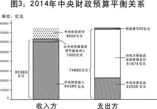 中央财政收入64380亿元,比2013年执行数(下同)增长7%。需要说明的是,按照党的十八届三中全会决定精神,收入预算从约束性转向预期性,由收入任务数变为收入预计数。从中央预算稳定调节基金调入1000亿元,合计收入总量预计为65380亿元。中央财政支出74880亿元,增长9.3%(扣除预备费后增长8.6%)。其中,中央本级支出22506亿元,中央对地方税收返还和转移支付51874亿元,中央预备费500亿元。收支总量相抵,中央财政赤字预计为9500亿元,比2013年增加1000亿元。中央财政国债余额限额100708.35亿元。中央预算稳定调节基金余额为483.08亿元。