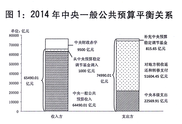 中央一般公共预算收入64490.01亿元,为预算的100.2%,增长7.1%。加上从中央预算稳定调节基金调入1000亿元,使用的收入总量为65490.01亿元。中央一般公共预算支出74174.36亿元,完成预算的99.1%,增长8.3%(其中,中央本级支出22569.91亿元,完成预算的100.3%,增长10.2%)。加上补充中央预算稳定调节基金815.65亿元,支出总量为74990.01亿元。收支总量相抵,中央财政赤字9500亿元,与预算持平。2014年末,中央财政国债余额95655.45亿元,控制在年度预算限额100708.35亿元以内;中央预算稳定调节基金余额1341.15亿元。