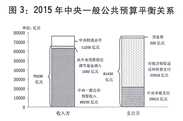 中央一般公共预算收入69230亿元,比2014年执行数增长7%。从中央预算稳定调节基金调入1000亿元,合计收入总量为70230亿元。中央一般公共预算支出81430亿元,增长9.5%(扣除预备费后增长8.8%)。其中,中央本级支出25012亿元,中央对地方税收返还和转移支付55918亿元,中央预备费500亿元。收支总量相抵,中央财政赤字为11200亿元,比2014年增加1700亿元。中央财政国债余额限额111908.35亿元。中央预算稳定调节基金余额为341.15亿元。